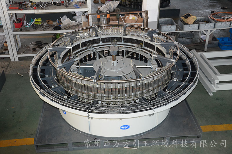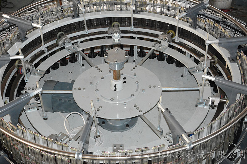 圓織機(jī)的經(jīng)紗架上有有許多紗錠,依據(jù)編織布幅寬和扁絲寬度,使用規(guī)定范圍數(shù)量的經(jīng)紗.經(jīng)紗進(jìn)入圓織機(jī)前,由經(jīng)紗的棕框?qū)?jīng)紗進(jìn)行交叉開口,緯紗梭子在交叉開口中作圓周運(yùn)動(dòng)穿過經(jīng)紗,編織成筒布. 一臺(tái)圓織機(jī)有幾把梭子,就有幾條緯紗同時(shí)織入.對(duì)于平織布,可用平織機(jī),片梭織機(jī),噴水織機(jī)編織.